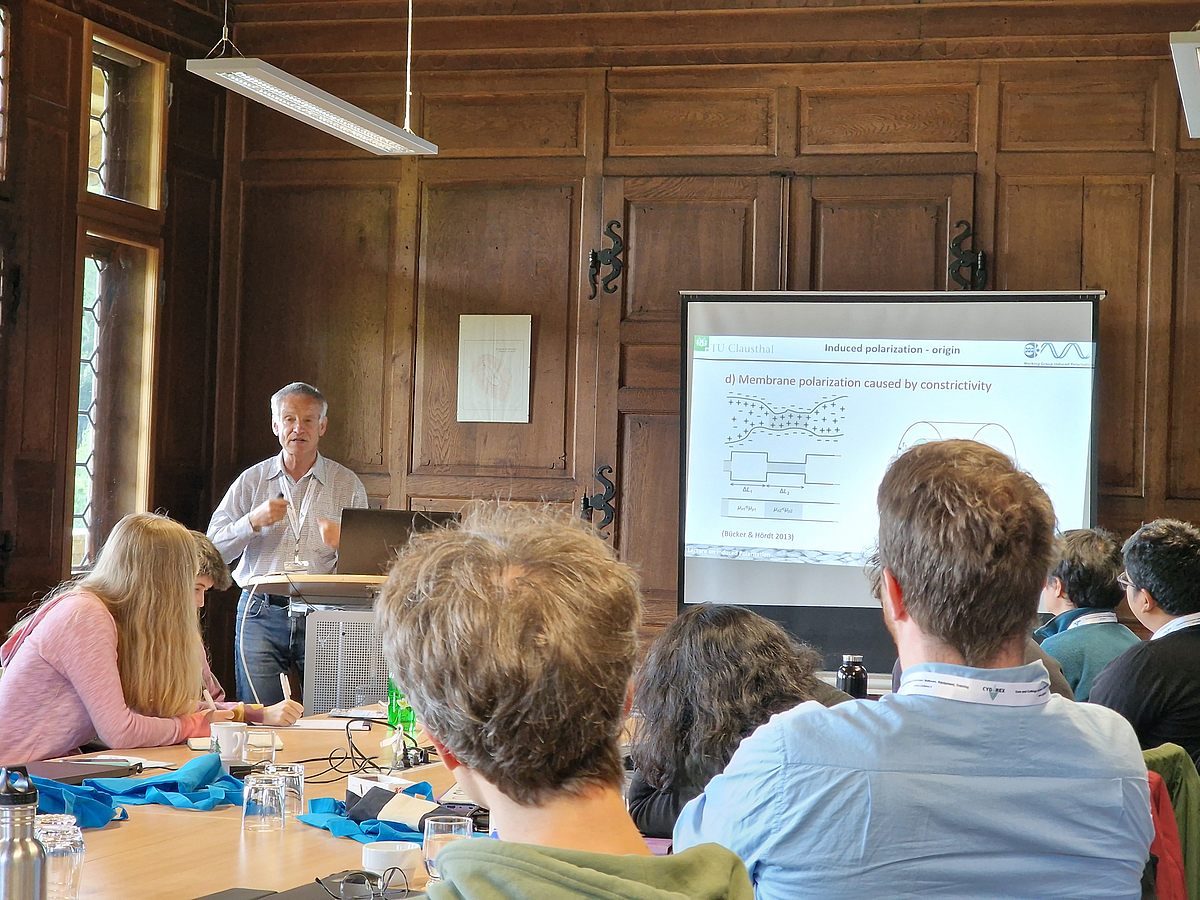 Der Vorlesungsteil umfasste Einführungen in die Grundwasserproblematik (Georg Houben, BGR) und in die Induzierte Polarisation (Andreas Weller, TU Clausthal), Permeabilitätsvorhersage mittels IP (Andreas Weller), Feld-IP-Messungen mit hydrogeophysikalischen Bezug (Tina Martin, Lund University, Schweden), IP für biogeophysikalische Fragestellungen (Adrian Mellage, Uni Kassel), Feld-IP mit Bezug zu Grundwasserkontamination (Adrian Flores Orozco, TU Wien, Österreich), petrophysikalische Messungen im Labor mit Verbindung zur IP (Matthias Halisch, LIAG), SIP an unkonsolidierten und teilgesättigten porösen Medien (Katrin Breede, TU Clausthal) und mikroskalige IP-Modellierung (Matthias Bücker, Uni Kiel). Jenseits der IP diskutierten die Teilnehmer:innen untereinander Strategien und Vernetzungsmöglichkeiten, die das Leben und Arbeiten in der Wissenschaft vor allem für Nachwuchswissenschaftler:innen verbessern können (Ankita Prayag, Lund University, Schweden, und Dennis Kreith, Uni Kiel/TU Braunschweig).
